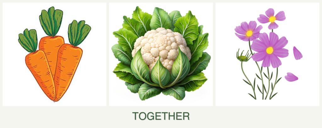 Timing: Plant carrots and cauliflower in early spring or fall. Cosmos can be sown after the last frost.