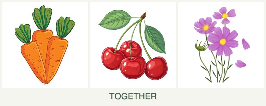 - Growth Requirements: Carrots need space underground, cherries require a lot of room above ground, and cosmos can grow in between but may not provide significant benefits.