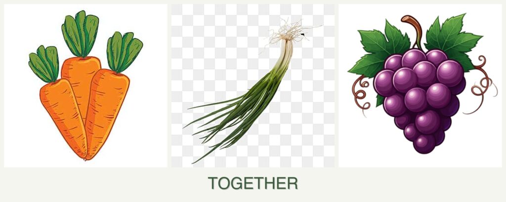 - Growth Requirements: Carrots and chives thrive in similar conditions, while grapes need more space and support structures.