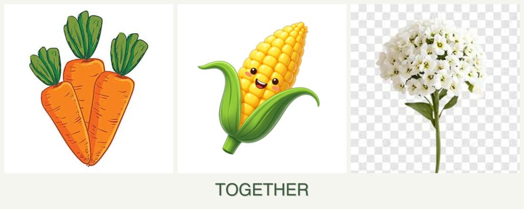 - Timing: Plant corn after the last frost, followed by carrots and alyssum a few weeks later.