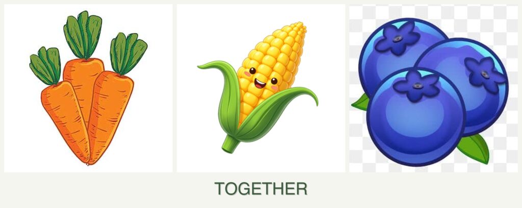 - Timing: Plant corn and carrots in spring, while blueberries can be planted in spring or fall, depending on climate.