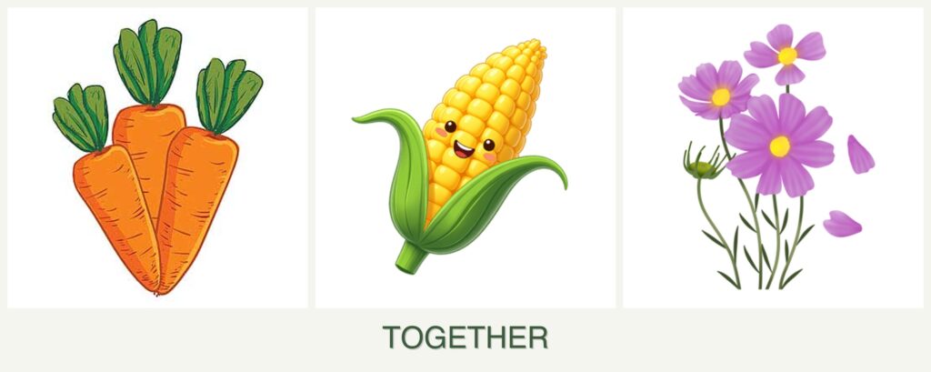 - Space Efficiency: The vertical growth of corn and cosmos allows carrots to spread underground without interference.