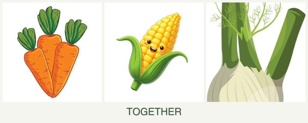 - Timing: Plant corn and carrots in spring after the last frost. Fennel can be planted in early spring or late summer.