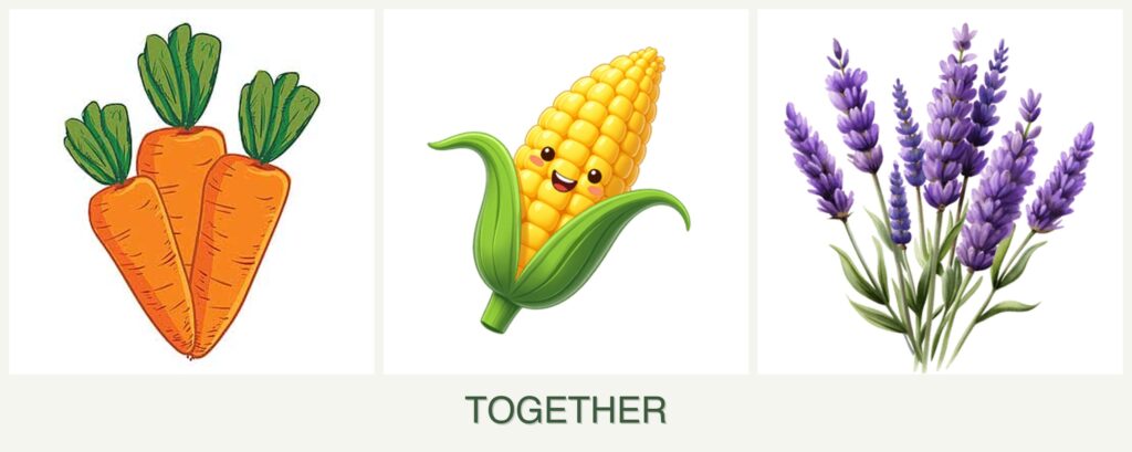 - Competition for Resources: Corn’s high nutrient and water demands can overshadow carrots and lavender.