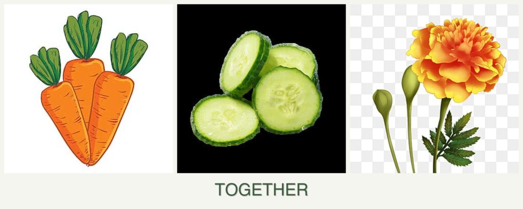 Pest Control: Marigolds are known for their pest-repellent properties, particularly against nematodes, which can harm carrots. Cucumbers benefit from marigolds’ ability to deter aphids and beetles.