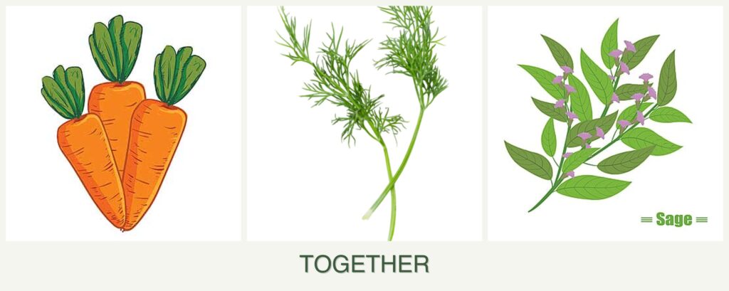 - Pest Control: Dill attracts predatory insects like ladybugs, which can help control aphid populations, benefiting carrots. Sage repels pests such as carrot flies.