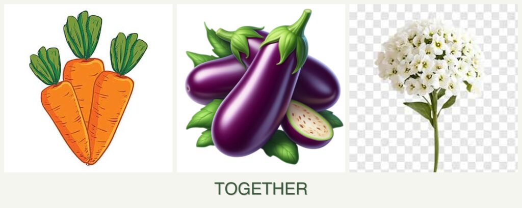 - When to Plant: Start carrots early in the season; plant eggplants after the last frost. Alyssum can be sown alongside either.