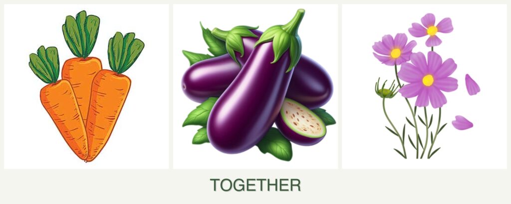 - Competition for Resources: Eggplants require more nutrients than carrots and cosmos, so ensure adequate fertilization.