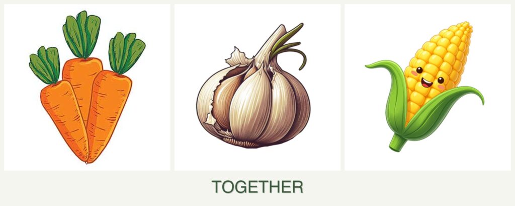 - Growth Requirements: Corn, being a tall plant, provides shade and acts as a natural trellis, which can benefit carrots by protecting them from excessive heat. Garlic, with its pungent scent, can deter pests that might otherwise target corn and carrots.