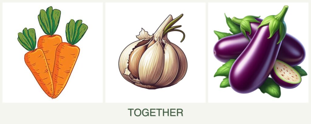 Growth Requirements: Carrots thrive in cool weather and need loose, sandy soil to develop their roots, while eggplants prefer warm temperatures and rich, well-drained soil. Garlic, on the other hand, can adapt to various conditions but needs full sun.