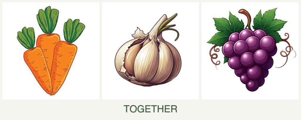 - Nutrient Needs: Carrots and garlic do not heavily compete for nutrients, while grapes require more nutrients, especially during fruiting.