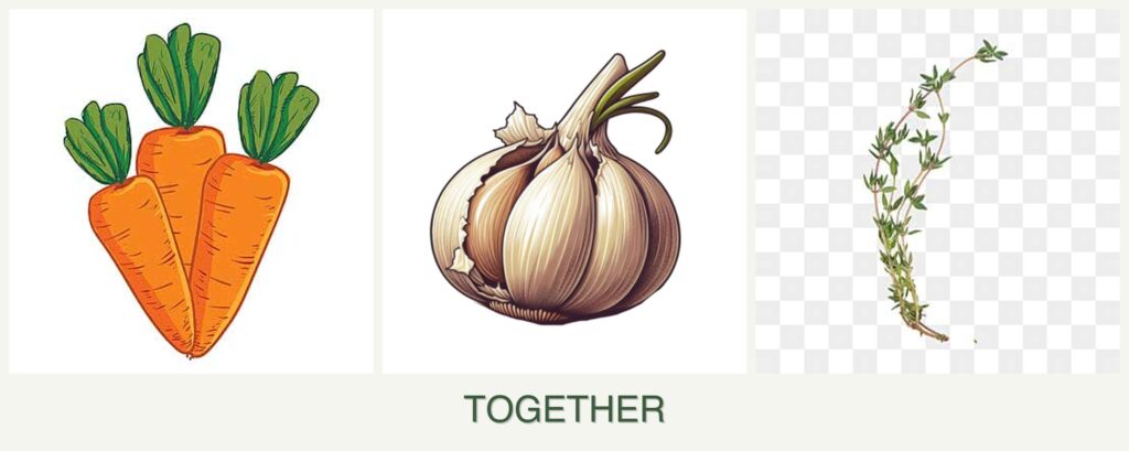 Carrots, garlic, and thyme share common ground in their need for full sun and well-drained soil. Carrots and garlic are root crops, while thyme is a low-growing herb, minimizing competition. Garlic’s strong scent deters pests like carrot flies, protecting carrots. Thyme attracts beneficial insects, enhancing pollination and overall garden health.