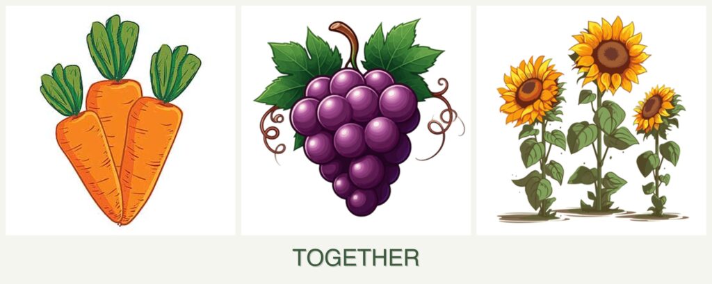 Growth Requirements: Carrots prefer cooler temperatures and loose, sandy soil, while grapes thrive in well-drained, loamy soil with ample sunlight. Sunflowers require full sun and can tolerate various soil types but need plenty of space to spread their roots.