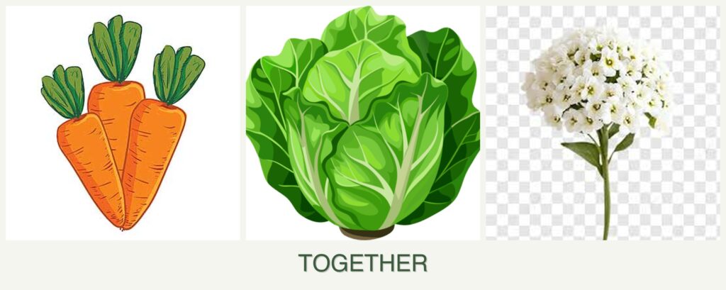 - Spacing: Lettuce grows quickly and can be harvested early, allowing more room for carrots to mature. Alyssum’s low-growing habit makes it an excellent ground cover without overshadowing the other plants.