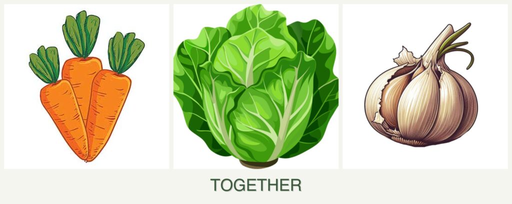 - Spacing: Lettuce’s shallow roots and smaller size allow it to fit well between rows of carrots and garlic.