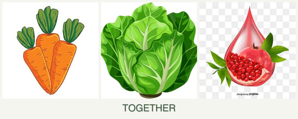 Carrots and lettuce work well together because they have similar growth requirements and can benefit each other. Lettuce provides shade to the soil, helping to keep it cool and moist for carrots. However, pomegranates are woody shrubs or small trees that require more space and different soil conditions, making them incompatible with the other two.