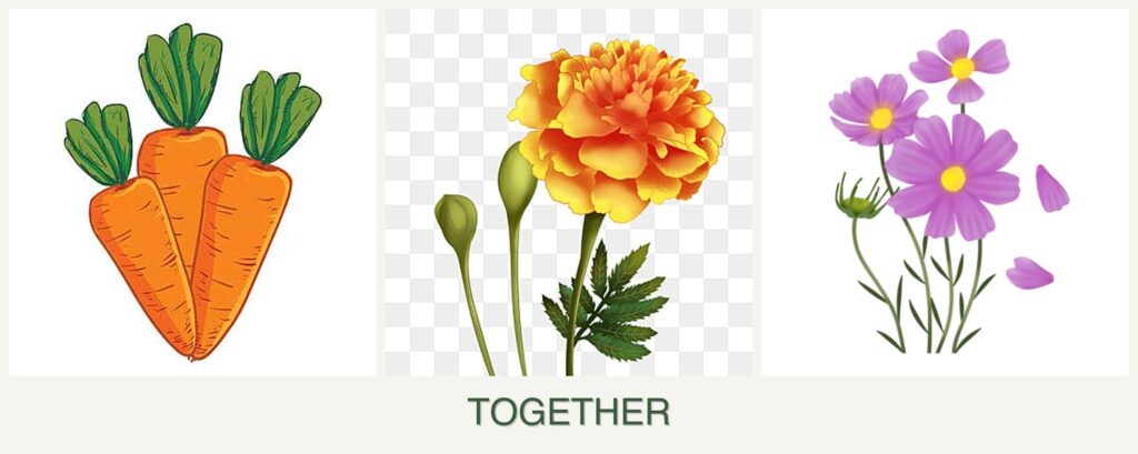 - Nutrient Needs: Carrots are root vegetables that prefer loose, sandy soil, whereas marigolds and cosmos are less demanding, thriving in average garden soil.
