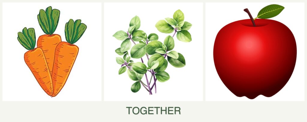- Growth Requirements: Carrots and oregano have similar light and soil needs, but apples require more space.