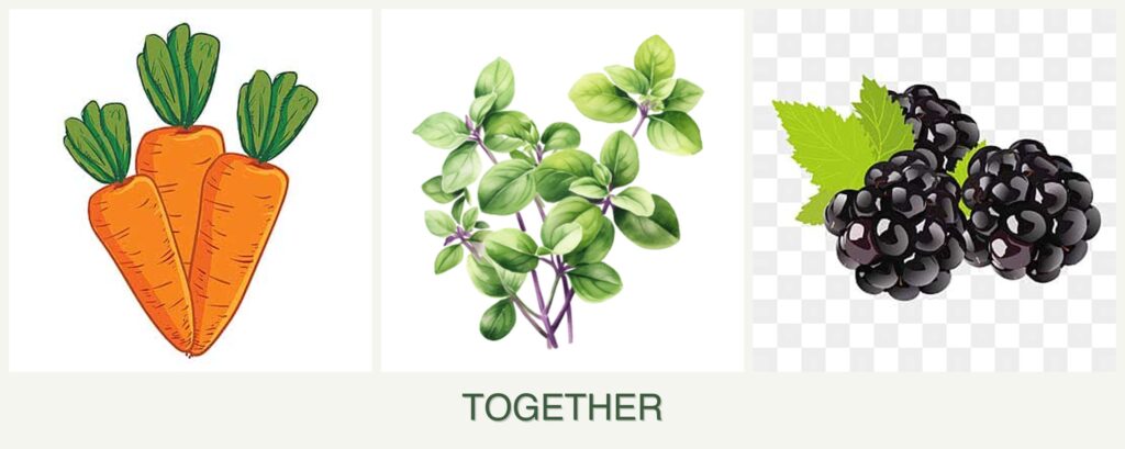 - Growth Requirements: Carrots and oregano have similar water and sunlight needs, while blackberries require more space.