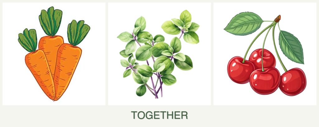 Can carrots, oregano, and cherries be planted together?