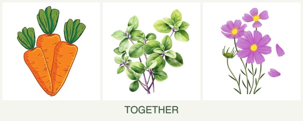 - Growth Requirements: Carrots need full sun and well-drained soil, similar to oregano and cosmos.