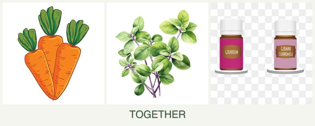 Growth Requirements: Carrots need loose, well-drained soil to grow straight and healthy. Oregano thrives in similar conditions, preferring a slightly drier environment, while geraniums are adaptable but prefer well-drained soil.