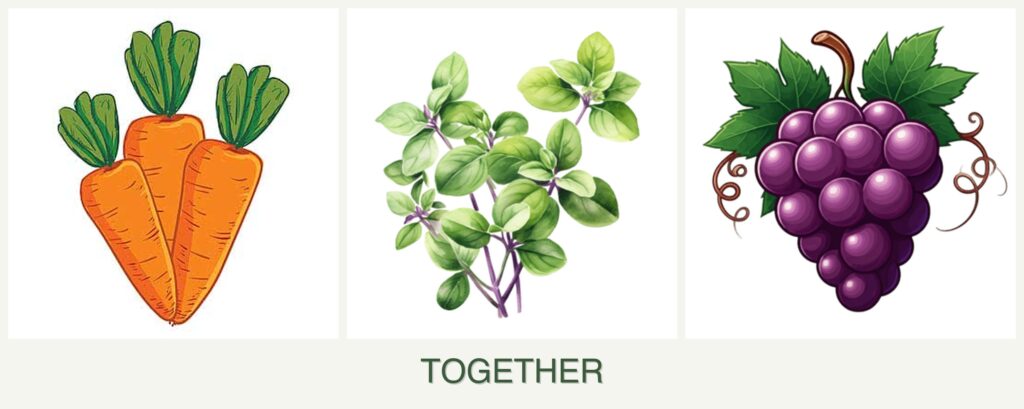 Planting carrots, oregano, and grapes together can offer several benefits: