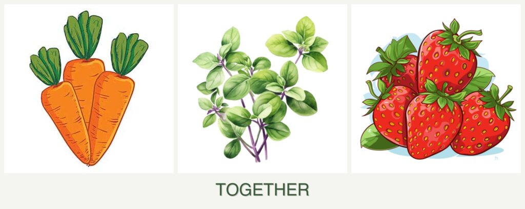 - Growth Requirements: Carrots grow underground, oregano spreads horizontally, and strawberries grow close to the ground, making them spatially compatible.