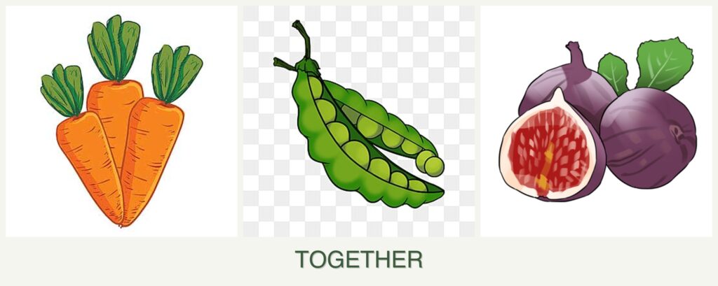 - Growth Requirements: Carrots and peas thrive in similar conditions, while figs require more sunlight and space.