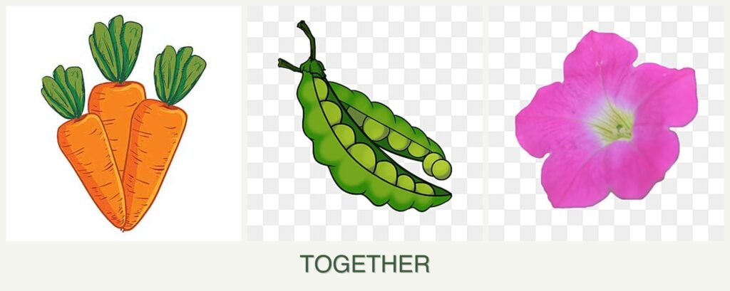 - Growth Requirements: Carrots and peas share similar sunlight and soil preferences, while petunias add aesthetic value and pollinator attraction.