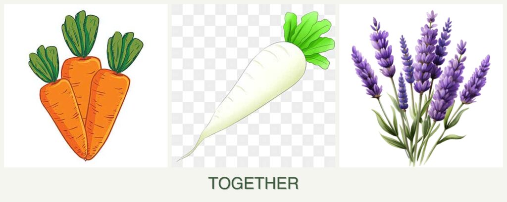 - Nutrient Needs: Carrots and radishes have similar nutrient requirements, whereas lavender is less demanding.