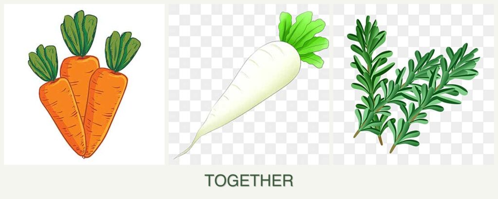 - Growth Requirements: Carrots and radishes share similar soil and water needs, while rosemary prefers drier conditions.