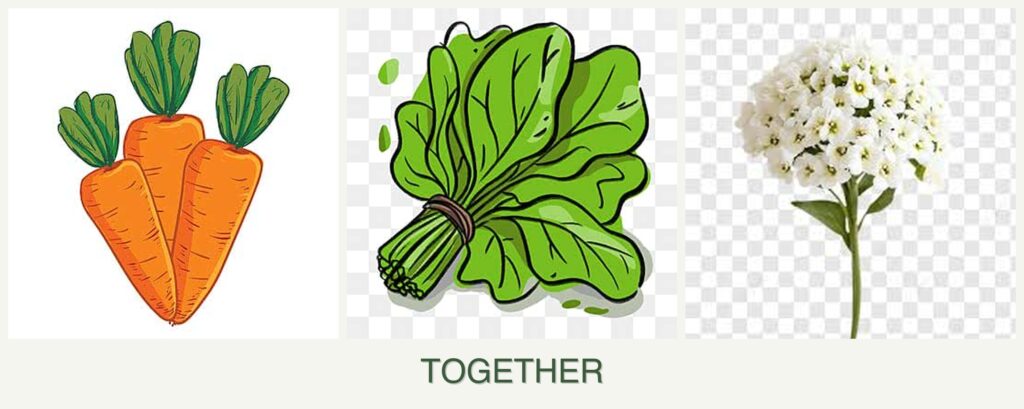 - Growth Requirements: Carrots and spinach have similar sunlight and water needs, while alyssum is adaptable.