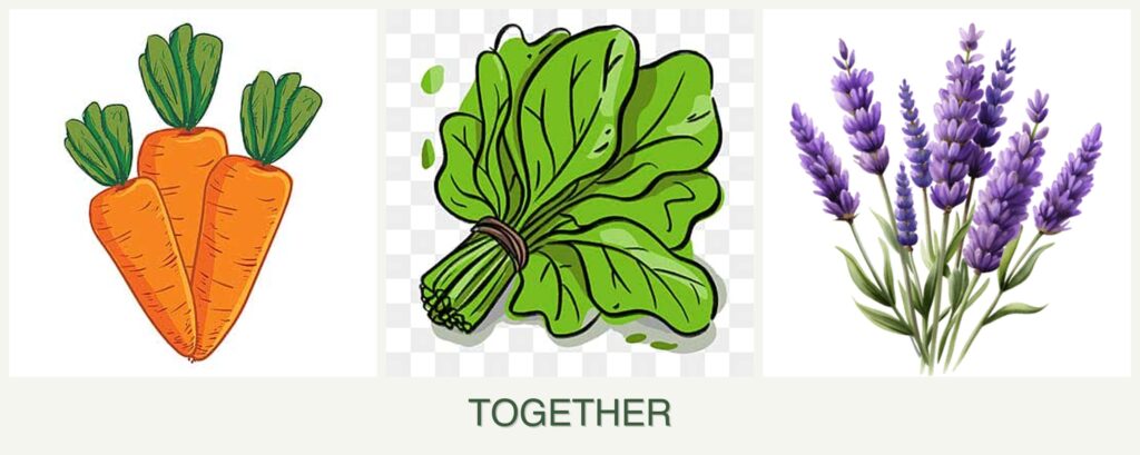- Growth Requirements: Carrots and spinach prefer cooler temperatures and similar soil conditions, while lavender thrives in well-drained soil and warmer conditions.