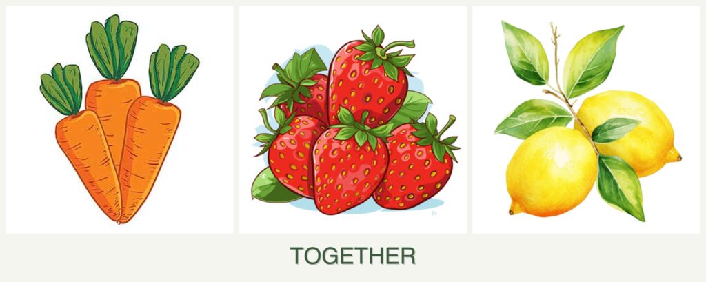 - Spacing: Carrots and strawberries can be planted closer together, but lemons, as trees, require much more space, which complicates companion planting in a typical garden bed.