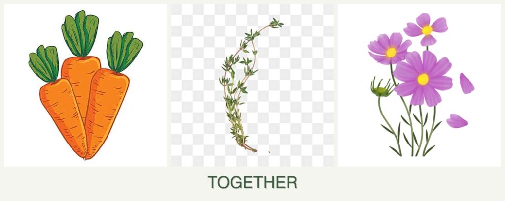 Nutrient Needs and Spacing: These plants have compatible nutrient needs. Carrots grow underground, while thyme and cosmos occupy above-ground space, minimizing competition.