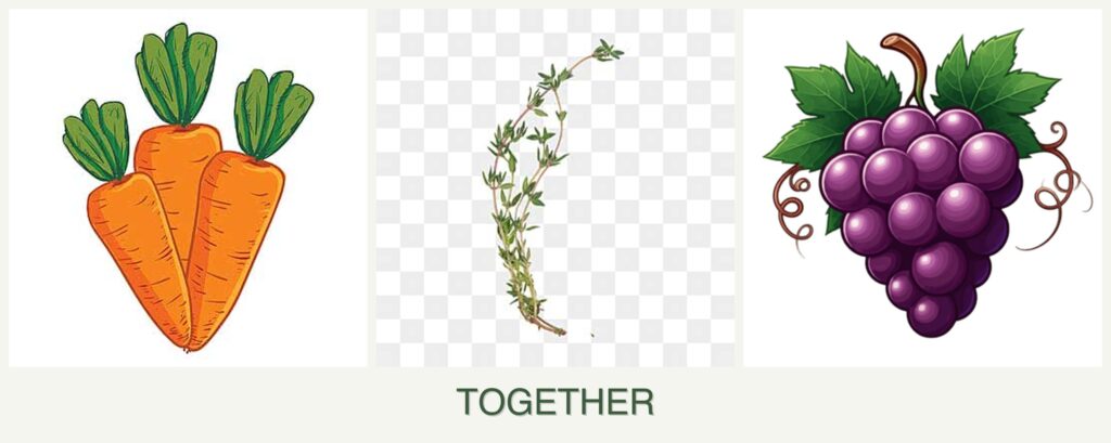 - Spacing: Carrots grow underground, thyme spreads horizontally, and grapes climb vertically, allowing for efficient use of space.