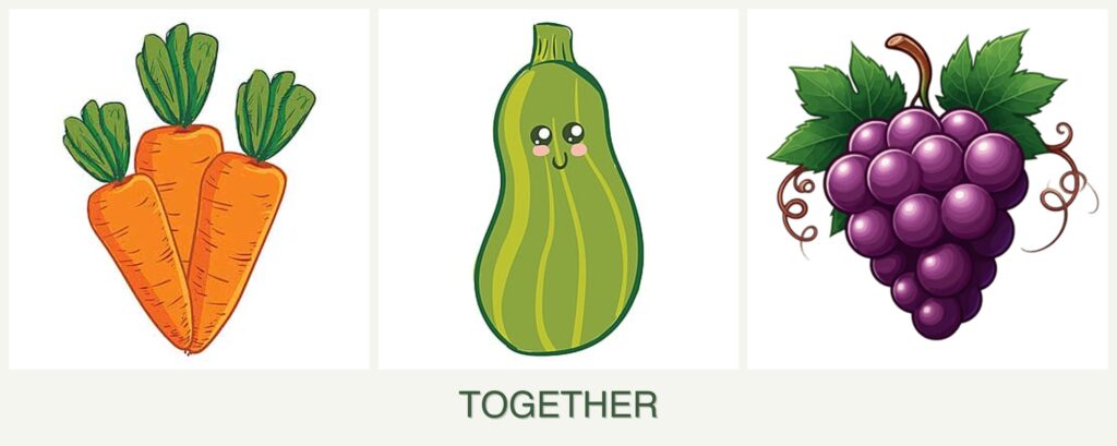 Timing: Plant carrots in early spring or late summer, zucchini after the last frost, and grapes in early spring.