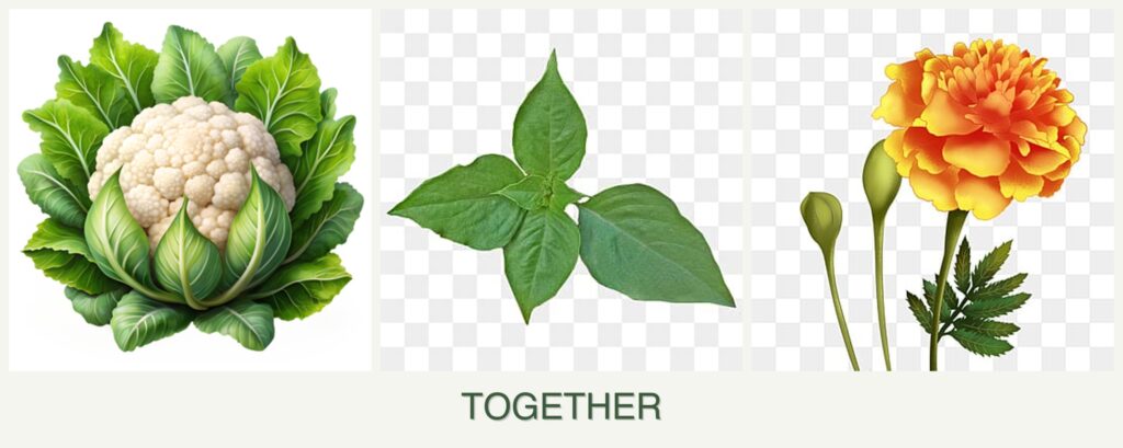 Competition for Resources: Cauliflower’s larger size and nutrient needs may overshadow basil and marigolds if not spaced properly.