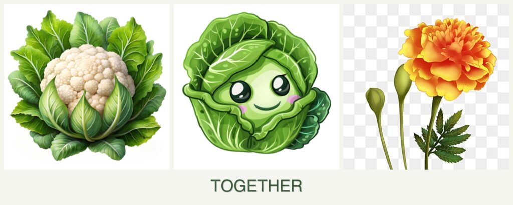 Planting cauliflower, cabbage, and marigolds together offers several benefits: