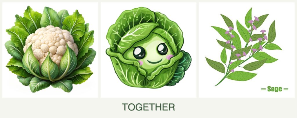 - Growth Requirements: Cabbage and cauliflower thrive in similar conditions, while sage prefers slightly drier soil.