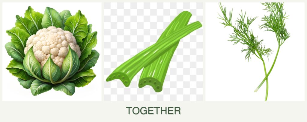 Dill can attract beneficial insects that help control pests harmful to cauliflower and celery. However, all three plants have different nutrient needs, with cauliflower and celery being more demanding.