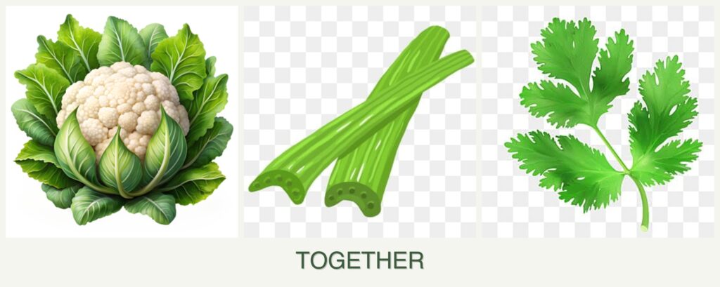 Nutrient Needs: All three plants benefit from a nutrient-rich environment. Cauliflower and celery, being heavy feeders, require ample nitrogen, which parsley can help provide by improving soil health through its root systems.