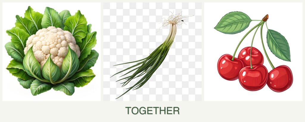 - Growth Requirements: Cauliflower and chives both prefer full sun and well-drained soil, while cherries need more space and may cast shade.