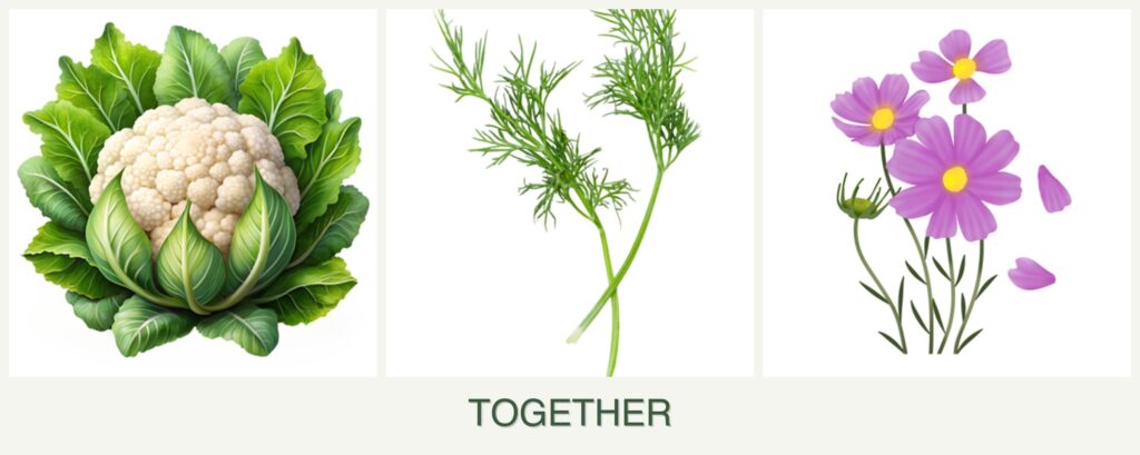 - Competition for Resources: Cauliflower’s nutrient demands may overshadow dill and cosmos. Ensure soil fertility is maintained.