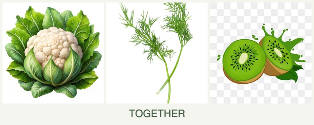 Kiwi with Cauliflower and Dill: Kiwi is a perennial vine that requires a trellis or support system and has very different growth requirements compared to the annual, cool-season cauliflower and dill. Kiwi’s extensive root system and need for full sun and ample space make it difficult to grow alongside these smaller, sun-sensitive plants.