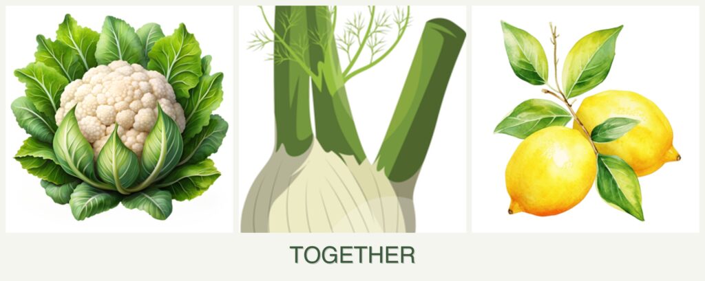 Growth Requirements: Cauliflower and fennel have similar growth requirements, needing cool weather and well-drained soil. Lemons, however, thrive in warm climates, requiring a different set of conditions.