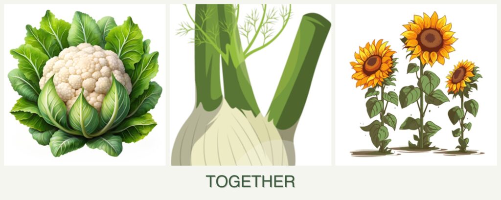 Nutrient Needs and Spacing: Cauliflower requires rich, fertile soil, while sunflowers are heavy feeders that can deplete soil nutrients. Fennel’s deep root system can disrupt the growth of nearby plants, making spacing a critical issue.