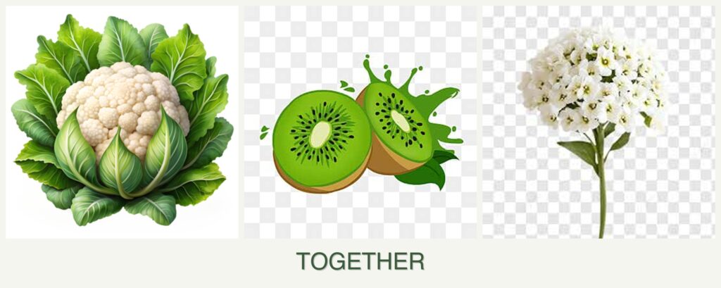 - Nutrient Needs: Kiwi is a heavy feeder and may compete with cauliflower for nutrients, while alyssum is less demanding.