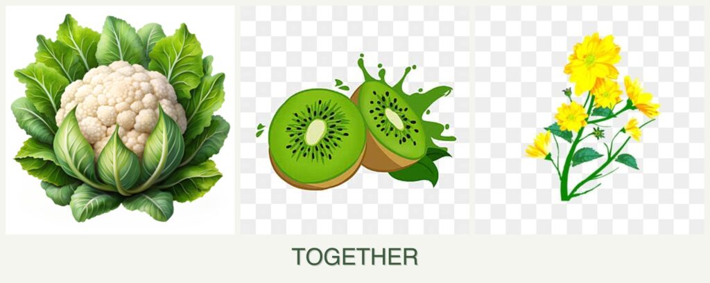 - Growth Requirements: Cauliflower prefers cool weather, kiwi thrives in warm climates, and calendula is adaptable but prefers sun.